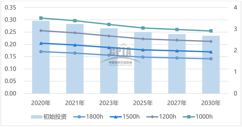 據CPIA預計,2021年,隨著產業鏈各環節新建產能的逐步釋放,組件價格回歸合理水平,光伏系統初始全投資成本可下降至3.81元/W,到2030年,我國光伏系統初始投資成本將會降至3.15元/W。
