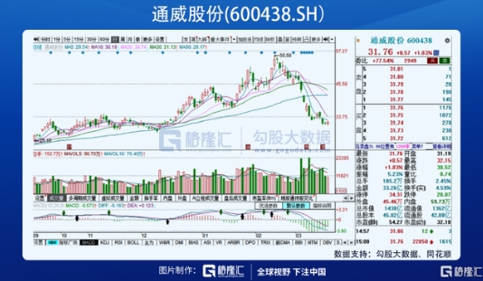 通威周一跌近8%,兩天交易日基本橫盤;通威受顆粒硅和2020Q4減值事件影響,從最高點下來,跌近43%。