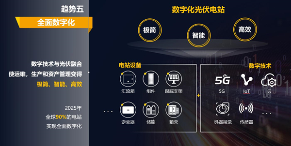 數(shù)字技術(shù)與光伏技術(shù)融合,使運(yùn)維、生產(chǎn)管理和資產(chǎn)管理變得極簡、智能、高效。數(shù)字化是智能化基礎(chǔ)。隨著5G、云等數(shù)字化技術(shù)快速演進(jìn),預(yù)計(jì)2025年將有90%以上的電站實(shí)現(xiàn)全面數(shù)字化,讓光伏電站極簡、智能、高效的管理成為可能,從一個(gè)啞電站變成一個(gè)有機(jī)的智能生命體。