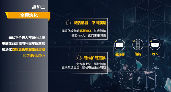 逆變器、PCS、儲(chǔ)能等關(guān)鍵核心部件,設(shè)備間采用標(biāo)準(zhǔn)接口,靈活擴(kuò)容,快速部署;逆變器不管交流還是直流側(cè),具備儲(chǔ)能接口,面向未來演進(jìn)。同時(shí)隨著光伏電站規(guī)模和復(fù)雜度越來越高,專家上站維護(hù)的傳統(tǒng)模式成本過高。模塊化設(shè)計(jì)可以實(shí)現(xiàn)免專家維護(hù),極大降低運(yùn)維成本、提升系統(tǒng)可用度。全模塊化設(shè)計(jì)將成為行業(yè)主流。