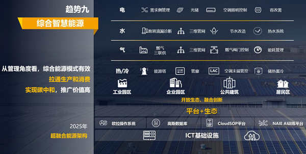 能源結(jié)構(gòu)轉(zhuǎn)向新一代綜合能源系統(tǒng)。從管理角度看,綜合能源模式會(huì)有效拉通生產(chǎn)和消費(fèi),助力實(shí)現(xiàn)碳中和,推廣價(jià)值更高。綜合能源是源-網(wǎng)-荷-儲(chǔ)一體化的自治系統(tǒng),需要以ICT基礎(chǔ)設(shè)施為底座,通過平臺(tái)+生態(tài)理念,融合創(chuàng)新,提升能源利用效率,降低能源成本。預(yù)計(jì)2025年,超融合能源架構(gòu)會(huì)大行其道。