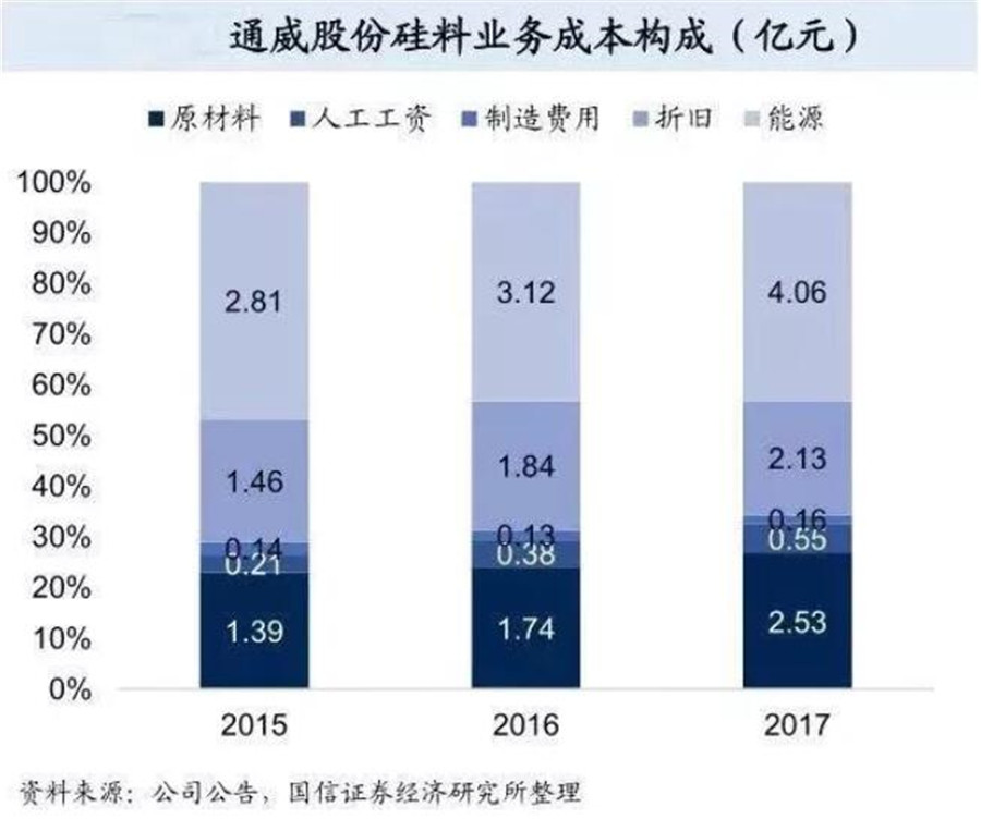 而通威除了后發(fā)優(yōu)勢之外,還具備明顯的成本優(yōu)勢。多晶硅生產(chǎn)成本中,能源成本、折舊成本、原料成本是主要部分,能源成本是重中之重。