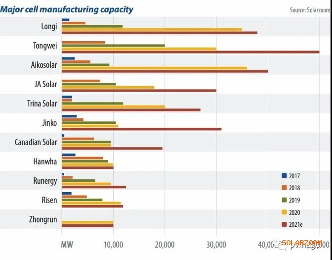 晶澳(JA Solar)、天合光能(Trina Solar)和晶科(Jinko)2020年各自新增了20 GW左右的產(chǎn)能,到2021年底,產(chǎn)能將分別達(dá)到30GW、27GW和31GW。