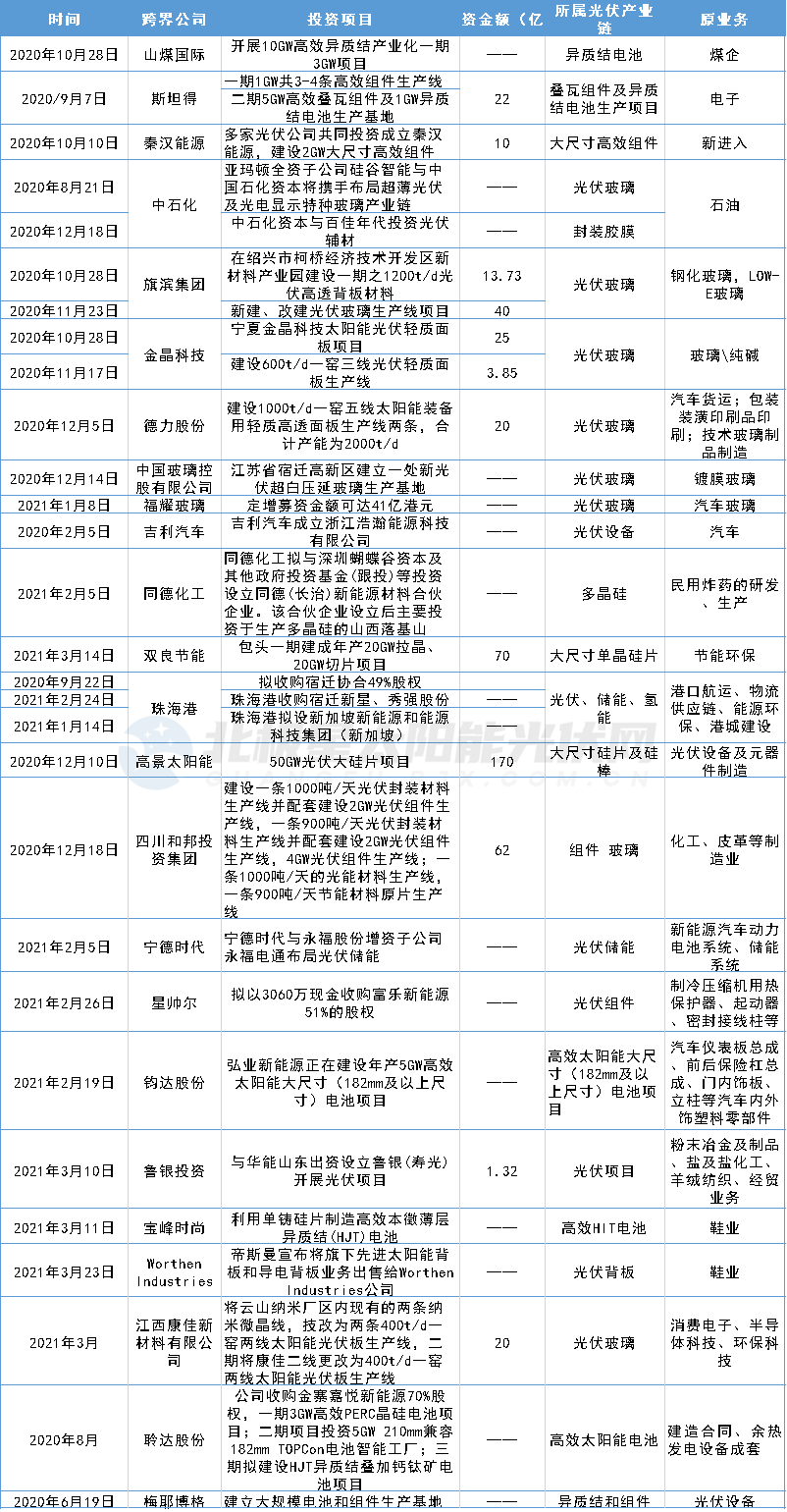 據北極星太陽能光伏網不完全統計,2020年以來,共有23家各行各業的公司跨界進入光伏,投入資金總額近千億元。這其中既有譬如中石油、中石化、山煤國際為代表的傳統能源巨頭的轉型,把光伏作為戰略新興業務進行謀劃,也包括圈外諸如比亞迪、吉利汽車、寶峰時尚等業內翹楚。