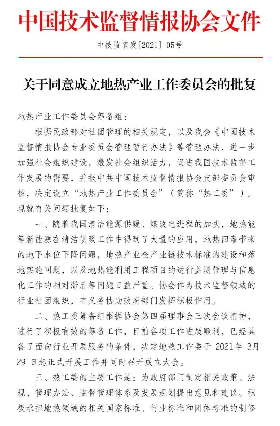 以下為中國技術監督情報協會批復成立地熱產業工作委員會的批復全文: