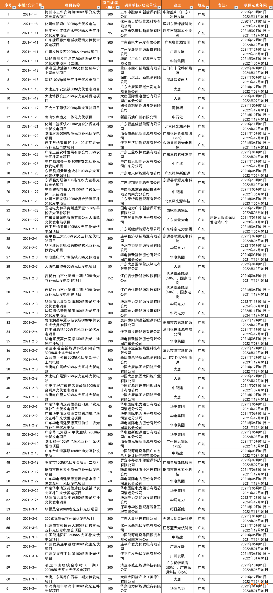 備注:表中僅列出總備案容量超過300MW的業主名單,因項目名單眾多,難免有疏漏,上述表格不做排名依據,僅供參考(備案項目統計截至2021.3.24)