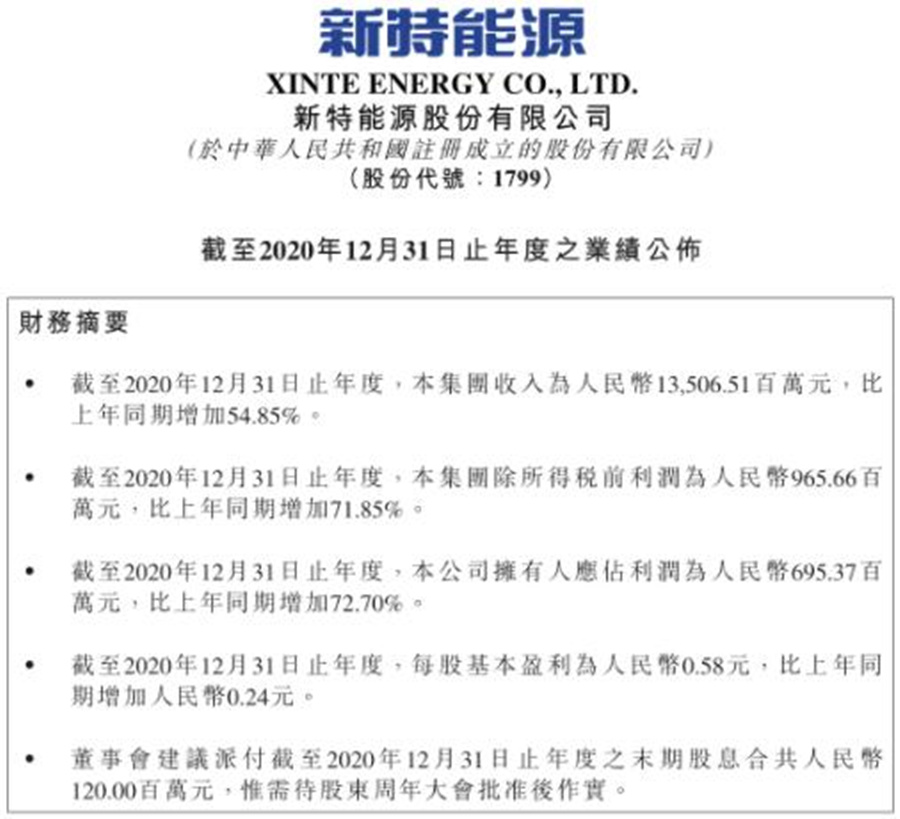 2020年,新特能源確認收入的多晶硅銷量為6.63萬噸,較上年同期增長約86.91%,主要是由于年產3.6萬噸高純多晶硅產業升級項目產能釋放所致。雖然不及保利協鑫和通威股份,但在2020年整體市場需求大漲,及下半年多晶硅價格上漲后,讓新特能源的營收和凈利潤雙雙暴漲。
