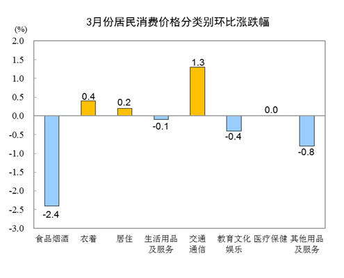 3月份,全國居民消費價格環(huán)比下降0.5%。其中,城市下降0.5%,農(nóng)村下降0.6%;食品價格下降3.6%,非食品價格上漲0.2%;消費品價格下降0.8%,服務(wù)價格下降0.1%。