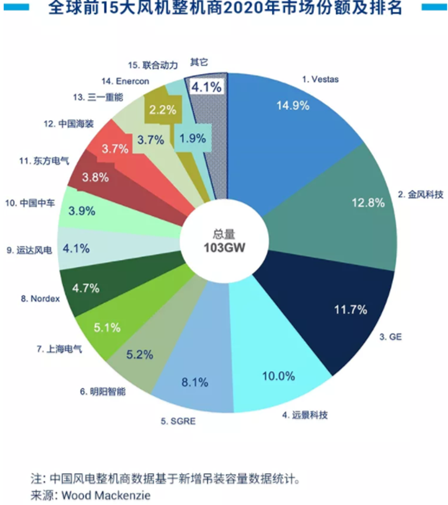 據伍德麥肯茲最新研究Global wind turbine OEMs 2020 market share(《2020年度全球風機整機企業(yè)市場份額排名》),全球新增風電裝機容量103GW。