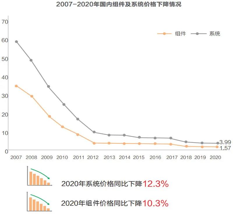 過去多年來,我國光伏產業成本大幅下降。在越來越多的國家和地區,光伏電價已經低于火電電價,成為最具競爭力的電力產品。根據中國光伏行業協會的統計,2011年-2020年,光伏系統價格下降超過4.3倍,組件價格下降超過5.7倍,2021年,我國已經全面進入平價時代。