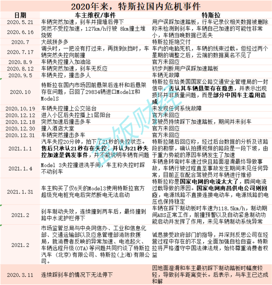 盒飯財經(jīng)對2020年以來,特斯拉國內(nèi)危機事件進行了梳理和統(tǒng)計。