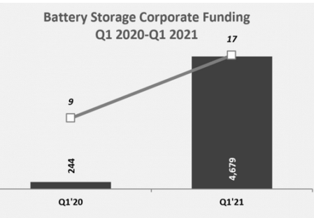調(diào)查表明,電池儲(chǔ)能廠商在去年第一季度只完成了9筆融資,總價(jià)值為2.44億美元,電池儲(chǔ)能行業(yè)的融資在2020年第一季度之后開(kāi)始逐步反彈,在第四季度獲得19筆融資,總額為31億美元,而2021年第一季度的融資表現(xiàn)更加顯著。