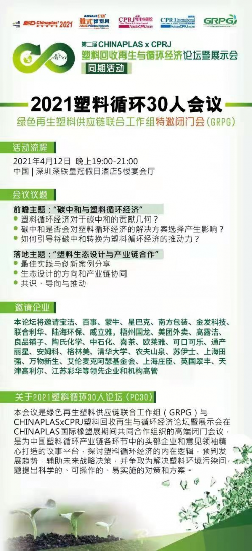 當晚19:00-21:00在會場酒店5樓宴會廳,綠色再生塑料供應鏈聯合工作組(GRPG)與本論壇共同合作高端閉門會議——2021塑料循環30人會議。該會議探討塑料循環經濟的內在邏輯,預判發展趨勢,輔助未來戰略決策,并爭取為解決塑料環境污染問題提出科學的、可操作的、易實施的對策和方案。