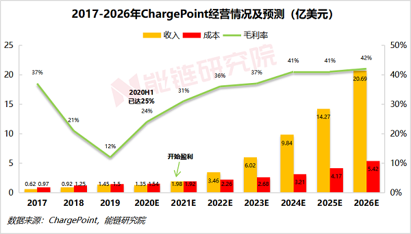 營收規(guī)模年均增長53%。2019年ChargePoint營業(yè)收入為1.45億美元,同比增長58%。2017-2019年,復合年均增長率為53%。預計2020年在新冠肺炎疫情影響下,仍將實現(xiàn)1.35億美元的營收規(guī)模,2026年將達到20.69億美元。