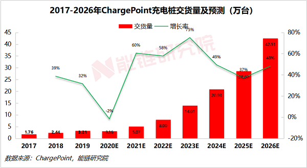 充電樁交貨量年均增長35%。2019年ChargePoint充電樁交貨量為3.21萬臺,同比增長32%。2017-2019年,復合年均增長率(CAGR)為35%。預計2020年將實現(xiàn)3.16萬臺交貨量,2026年將實現(xiàn)42.51萬臺。