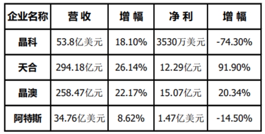 從晶科、天合、晶澳、阿特斯年報不難發現,各家營收額全面上浮。晶科營收晶科營收53.8億美元(約合352.6億元人民幣),同增18.10%;天合營收294.18億,同增26.14%;晶澳營收258.47億,同增22.17%;阿特斯營收34.76億美元(約合227.5億元),同增8.62%。