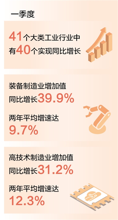 復蘇面不斷擴大。一季度,41個大類工業行業中有40個實現同比增長。