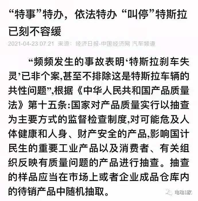 文章指出,由于“剎車失靈”等事故頻發,潛在的社會危害巨大,公眾對于特斯拉“剎車失靈”的疑慮并未因此消散。因此,很多業內外人士建議,在事故原因尚未查明之前,相關主管部門應責令特斯拉立即停產、停售整頓,以確保道路交通安全,進而消除社會公眾的恐慌。