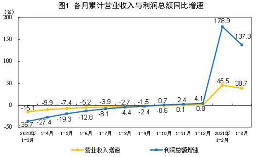 1—3月份,全國規模以上工業企業實現利潤總額18253.8億元,同比增長1.37倍(按可比口徑計算,詳見附注二),比2019年1—3月份增長50.2%,兩年平均增長22.6%。