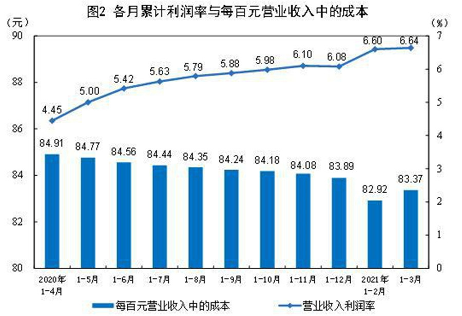 1—3月份,規模以上工業企業實現營業收入27.48萬億元,同比增長38.7%;發生營業成本22.91萬億元,增長36.5%;營業收入利潤率為6.64%,同比提高2.76個百分點。