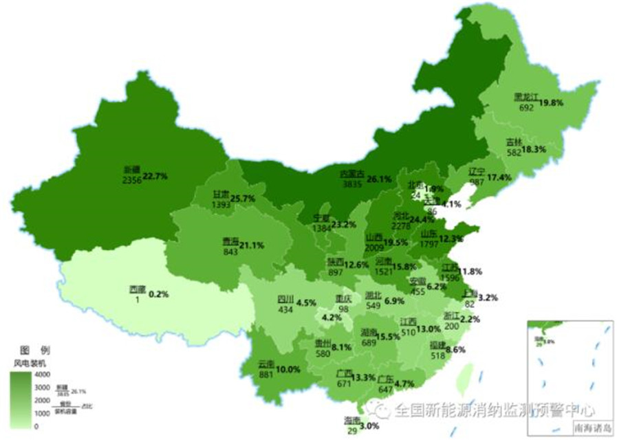 截至3月底各地區累計風電裝機(萬千瓦)及占本地區總裝機比重
