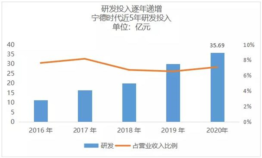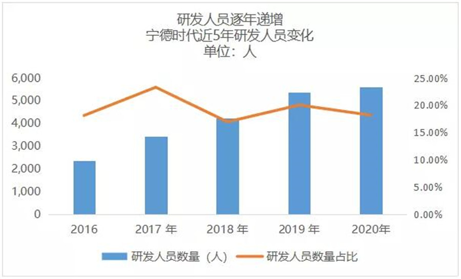 2020年,寧德時(shí)代研發(fā)在營(yíng)收中的占比達(dá)到7.09%,擁有研發(fā)技術(shù)人員5592 名。