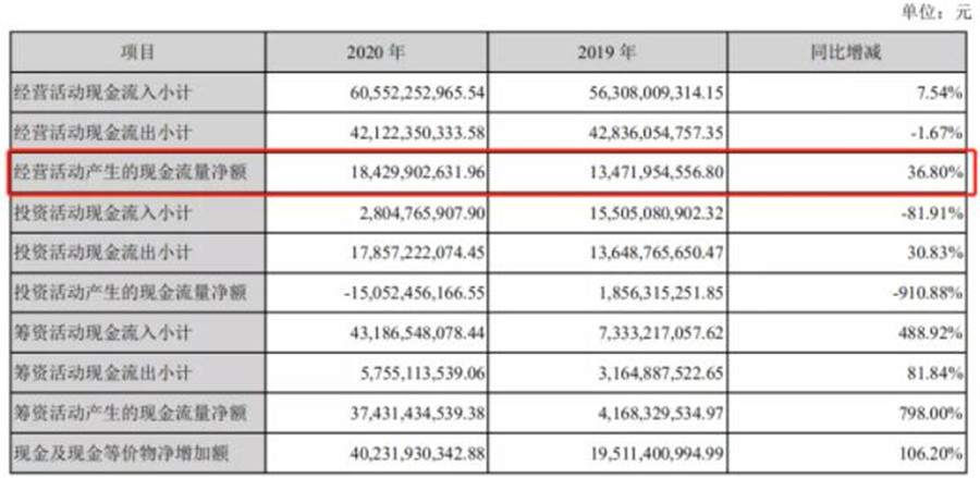 不過,寧德時(shí)代現(xiàn)金流非常充裕。2020年,寧德時(shí)代經(jīng)營(yíng)性現(xiàn)金流為184.30 億元,同比增長(zhǎng)36.8%,為凈利潤(rùn)的3.02 倍,其中2020第四季度經(jīng)營(yíng)性現(xiàn)金流為 81.24 億元,同比增長(zhǎng)158.1%,環(huán)比增長(zhǎng)81%;報(bào)告給出的原因是,主要是產(chǎn)品銷售情況良好,部分客戶支付預(yù)付款。