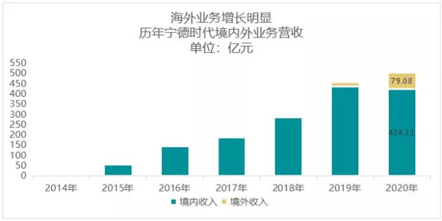 2020年,寧德時(shí)代境外業(yè)務(wù)營(yíng)收為79.08億元,營(yíng)收占比達(dá)到15.71%,而2019年這一數(shù)字僅為4.37%,同比大增295.30%。