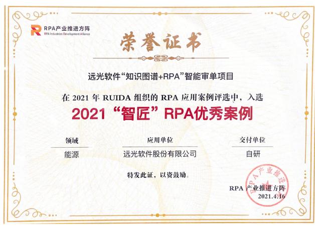 本次峰會由中國信息通信研究院(以下簡稱“中國信通院”)、中關(guān)村數(shù)智人工智能產(chǎn)業(yè)聯(lián)盟主辦,RPA產(chǎn)業(yè)推進方陣(RUIDA)承辦。峰會面向銀行、證券、保險、能源、制造、互聯(lián)網(wǎng)、教育、零售、醫(yī)藥等多個行業(yè)公開征集RPA應(yīng)用案例,并對評選出的優(yōu)秀案例進行表彰。通過行業(yè)專家評審、公開票選等層層評選,遠光軟件申報的“知識圖譜+RPA”智能審單項目案例脫穎而出,榮獲“2021‘智匠’RPA優(yōu)秀案例”獎。