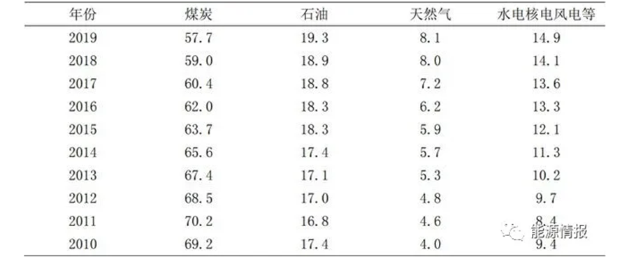 表 1 2010—2019 年中國能源消費結構占比 %