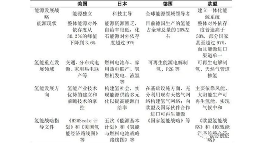 表 3 歐美日等國和地區氫能發展特點比較