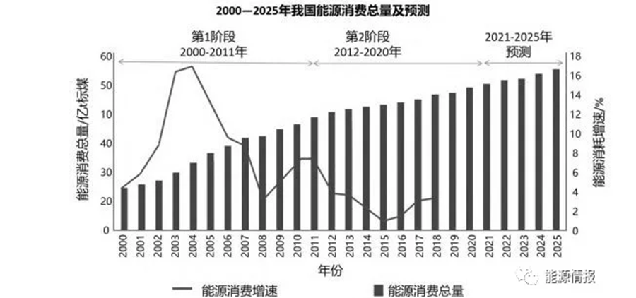 圖 2 2000—2025 年我國能源消費總量及增速變化