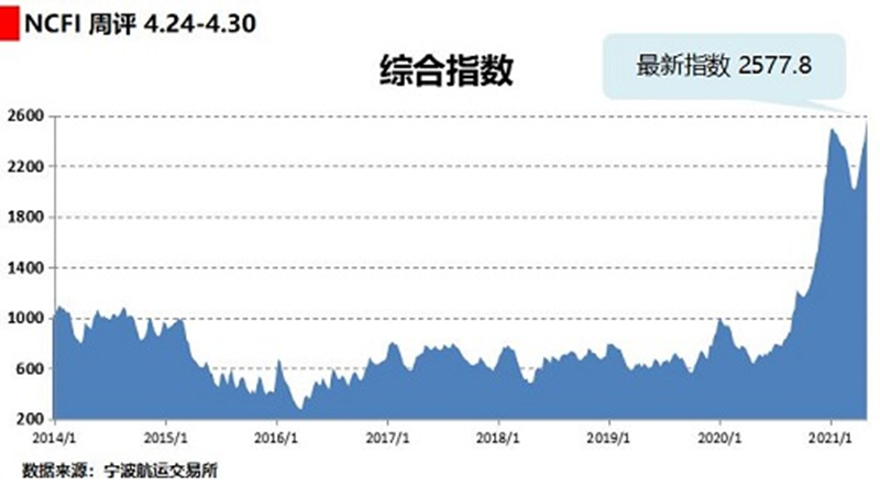 寧波航運交易所發(fā)布的海上絲綢之路指數(shù)之寧波出口集裝箱運價指數(shù)(NCFI)顯示:4月24日至30日,該指數(shù)報收于2577.8點,較上周上漲7.0%,綜合指數(shù)突破年前高位(2021年1月8日報收于2498.5點),刷新歷史新高。