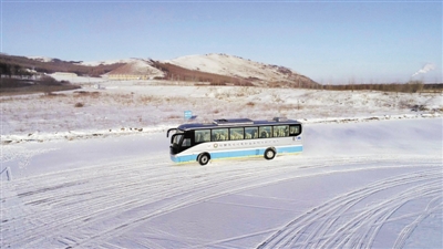 2019年1月,全氣候12米純電動公路客車在內蒙古海拉爾牙克石試驗場開展冰雪路面測試。 理工華創供圖