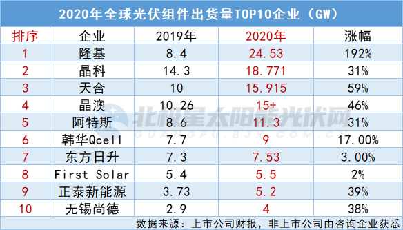 與2019年不同的則是,TOP5企業(yè)位置更迭,隆基以192%的增長率完成逆襲登頂榜首,天合保持第三位,晶科、晶澳、阿特斯排序略下移。