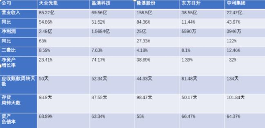 “應(yīng)收賬款周轉(zhuǎn)天數(shù)”中,表現(xiàn)最好的是隆基、天合和晶澳。“存貨周轉(zhuǎn)天數(shù)”方面,東方日升的最好,僅50天;晶澳其次,為87天左右。上述兩項中,中利集團比往年同期都有所下降,同樣可圈可點。資產(chǎn)負(fù)債率項上,所有公司都控制在70%以下。