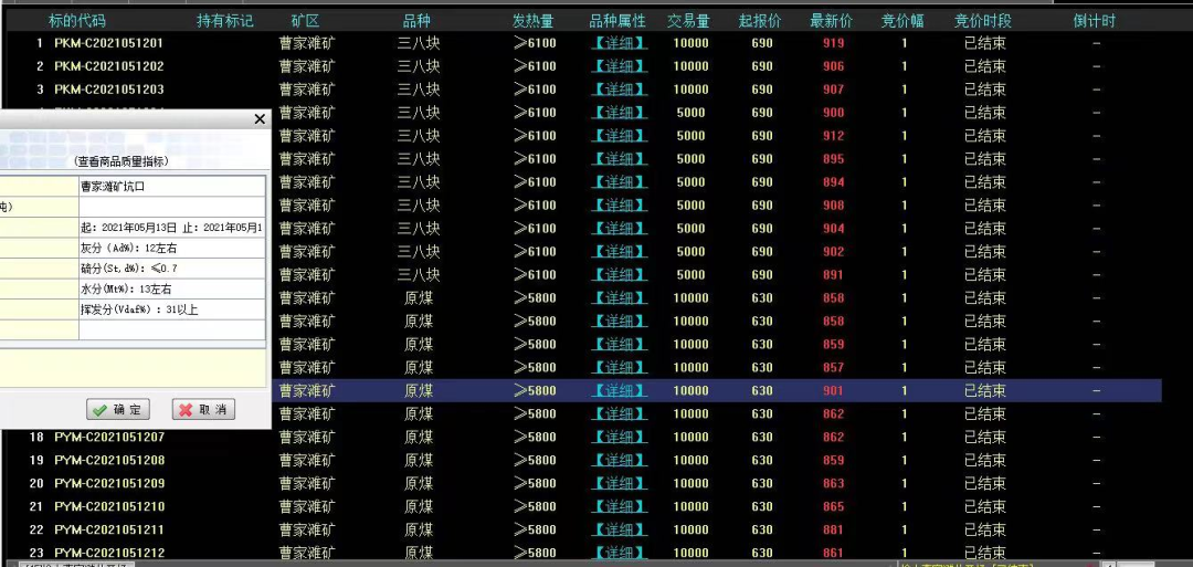 曹家灘煤礦最新競價,本期總交易量25萬噸,原煤18萬噸,較上期增加4萬噸,3-8塊7萬噸,較上期增加1萬噸,末煤未參與競價;本期原煤起拍價630元/噸,較上期上漲50元/噸,3-8塊起拍價690元/噸,,較上期上漲90元/噸;原煤最高成交價901元/噸,較上期上漲244元/噸,較起拍價上漲271元/噸;3-8塊最高成交價919元/噸,較上期上漲221元/噸,較起拍價上漲229元/噸。