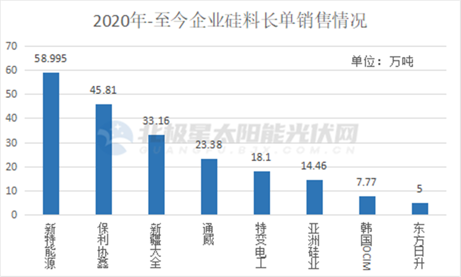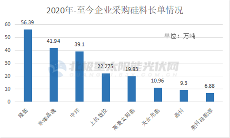 另一方面頭部企業(yè)的長單爆發(fā)加劇了市場的緊張情緒。據(jù)北極星太陽能光伏網(wǎng)統(tǒng)計信息,從2020年至今,未來3~5年的超200萬噸硅料已被長單鎖定。