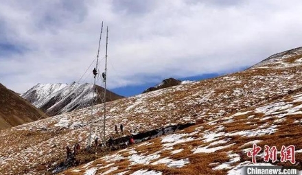 電力工人在組塔。黃俊琿 攝