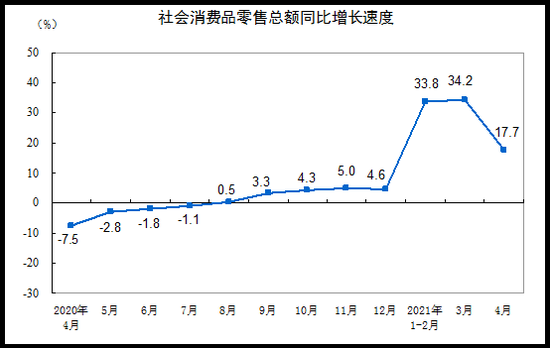 4月份,社會消費品零售總額33153億元,同比增長17.7%;比2019年4月份增長8.8%,兩年平均增速為4.3%。其中,除汽車以外的消費品零售額29468億元,增長17.9%。扣除價格因素, 4月份社會消費品零售總額實際增長15.8%,兩年平均增長2.6%。從環比看,4月份社會消費品零售總額增長0.32%。