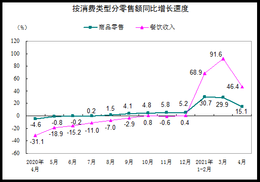 按消費類型分,4月份,商品零售29776億元,同比增長15.1%,兩年平均增長4.8%;餐飲收入3377億元,增長46.4%,兩年平均增長0.4%。1—4月份,商品零售124401億元,同比增長26.4%,兩年平均增長4.8%;餐飲收入13973億元,增長67.7%,兩年平均下降0.7%。