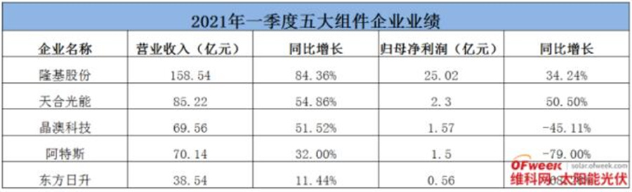 為此,OFweek太陽能光伏網(wǎng)對2020年出貨量領(lǐng)先的組件龍頭,一季度業(yè)績進行了統(tǒng)計。通過最終的營收及歸母凈利潤表現(xiàn),展現(xiàn)組件企業(yè)在光伏玻璃及硅料價格雙雙上漲后的經(jīng)營情況(因晶科能源暫未公布一季度報告,所以沒有列入本次統(tǒng)計)。