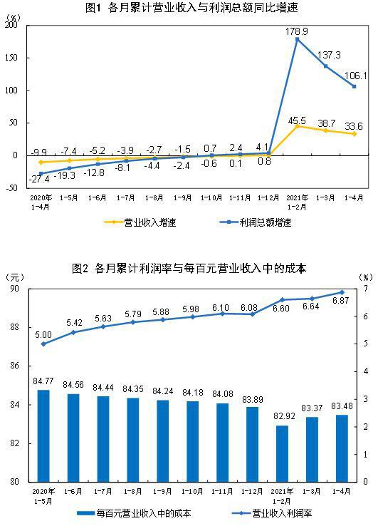 1—4月份,規模以上工業企業實現營業收入37.78萬億元,同比增長33.6%;發生營業成本31.54萬億元,增長31.4%;營業收入利潤率為6.87%,同比提高2.42個百分點。
