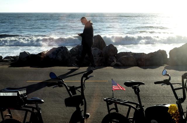 3月5日,一名男子走在美國加利福尼亞州半月灣市的海邊。(新華社記者吳曉凌攝)