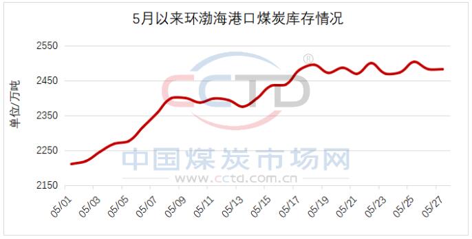 在產地煤企積極保供的努力下,近期環渤海港口煤炭庫存出現明顯增加,截止5月27日,CCTD監測的環渤海港口煤炭庫存量達到2482.7萬噸,較5月初增加272.3萬噸,增長12.3%。