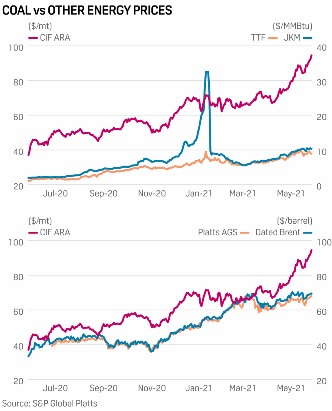 盡管面臨環境壓力,煤炭仍然是世界上發電的首要燃料,部分原因是它通常比天然氣更具競爭力。即使煤炭價格上漲,仍然沒有改變這一點。特別是在亞洲和歐洲,天然氣需求也在增加,側面支撐了煤炭價格的上漲。2021年5月28日,普氏JKM液化天然氣(LNG)市場的價格為10.313美元/MMBtu,比一年前的1.938美元/MMBtu上漲了432.1%。