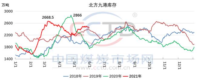 進入6月份,月初鄂爾多斯地區煤管票據恢復,供應量有所增加。但主產地煤礦安檢、環保檢查形勢依舊嚴峻,供給量未見大幅增加。加之市場看空氛圍下,上游發運積極性減弱,港口調入瓶頸顯現。受封航等因素影響,調出量雖有波動,整體仍維持高位。在上游供應不足,而下游需求旺盛的帶動下,預計港口庫存將呈現維持震蕩下行趨勢。
