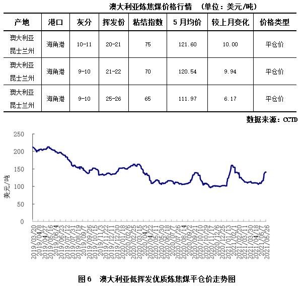 國際煉焦煤市場需求有所提升 澳洲焦煤價格止跌回升。本月,國內(nèi)焦煤市場偏強運行,價格居高不下。蒙古煤方面,由于5月份蒙古疫情較上月有所改善,加上口岸有意推進通關(guān)增加,當(dāng)月蒙煤通關(guān)量略有回升,但離正常水平仍有一定差距,整體來看貨源仍然偏緊。海運煤方面,因國內(nèi)優(yōu)質(zhì)低硫主焦煤價格快速大幅上漲,進口非澳煤價格優(yōu)勢明顯,中國對非澳海運煉焦煤需求有所增長,推動非澳海運煉焦煤到岸價格持續(xù)上漲。澳洲焦煤方面,本月澳洲焦煤離岸價受日韓等國補庫需求增加支撐而上行。