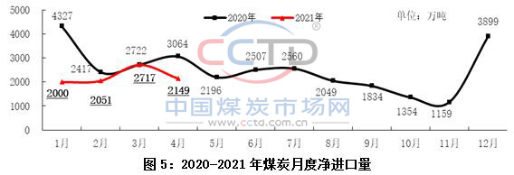 煤炭進口可能保持相對低位。1-4月份,我國煤炭進口量同比繼續大幅下降。隨著沿海地區用能用電企業開工率提升,預計沿海電廠煤耗水平將有所提高,電煤消費將繼續呈現淡季不淡特征,預計煤炭需求量將保持增長。而清潔能源發電出力增加以及東部省區能源雙控等因素將制約沿海地區煤炭需求增幅。在煤炭需求旺盛局面下,由于澳煤進口繼續受限,加上進口煤價格偏高,判斷后期我國煤炭進口量可能保持相對低位。