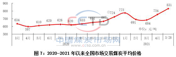 5月份以來,煤炭價格又有上漲。至5月28日,全國市場交易煤炭平均報價831.1元/噸,比上月末上漲10.2%;其中焦肥精煤平均報價為1566.4元/噸,比上月末上漲12.9%,中等動力煤平均報價709.0元/噸,比上月末上漲9.3%。